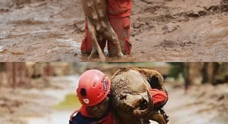 The rescuer didn’t see “just a dog.” He saw a life, fragile and desperate, worth every ounce of his strength. He dropped to his knees, plunging his arms into the muck, ignoring the pull of the current and the burn in his muscles. Slowly, carefully, he dug the dog free.