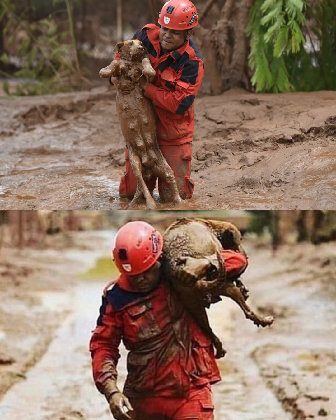 The rescuer never sought recognition. He returned quietly to his work, helping those still trapped, searching for more survivors. But the moment had already been captured—a photograph showing a man, drenched in mud, holding a fragile dog against his chest. It spread quickly, a symbol of humanity’s capacity for compassion even in the darkest hours.