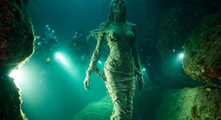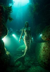 In what may be one of the most startling underwater discoveries in decades, a team of deep-sea divers has reportedly uncovered a preserved humanoid figure resembling the mythical mermaid, resting on the ocean floor near a long-forgotten trench. The specimen—partially skeletal yet covered in patches of iridescent scales—appears to possess both human-like bone structures and a long, finned tail. Images captured by the dive team show the body entombed in layers of sediment, its eerie silhouette illuminated by submersible lights. Experts have called the find “unprecedented,” though many caution that the evidence is still preliminary. The extraordinary nature of the remains has already sparked fierce debate across scientific, cultural, and online communities: could this be the first tangible proof of merfolk, or a remarkable but misunderstood natural formation?